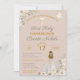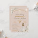 Incrível Primeira Santa Comunhão de convites florais com rusticidade, vintage inspirou elementos com a garota de vestido branco tradicional, contra um fundo bege de cogumelo mole. A parte de trás do convite apresenta uma cruz de estilo boho com flores de aquarela e verde. Troque a 'Primeira Comunhão' por 'Christening' ou 'Baptism', qualquer que seja o seu evento especial.