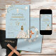Incrível Primeira Santa Comunhão de convites florais com rusticidade, vintage inspirou elementos com a garota de vestido branco tradicional, contra um fundo azul empoeirado. A parte de trás do convite apresenta uma cruz de estilo boho com flores de aquarela e verde. Troque a 'Primeira Comunhão' por 'Christening' ou 'Baptism', qualquer que seja o seu evento especial.
