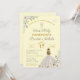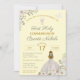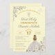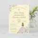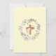 Incrível Primeira Sagrada Comunhão de convites florais com rusticidade, vintage inspirou elementos com a garota de vestido branco tradicional, contra um fundo amarelo macio. A parte de trás do convite apresenta uma cruz de estilo boho com flores de aquarela e verde. Troque a 'Primeira Comunhão' por 'Christening' ou 'Baptism', qualquer que seja o seu evento especial.