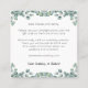 Isso enviará pessoas para o seu site, onde eles podem RSVP e ver todas as informações necessárias para participar do seu casamento e recepção. Esta placa de bolso tem folhas de eucalipto no topo e no fundo e um pequeno coração de ouro.