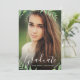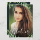Anúncio de fotos da formatura da Tendy e convite com roteiro elegante de caligrafia e folhagem botânica de aquarela. Personalize o design com sua foto personalizada, seu nome, data de graduação e detalhes do convite de festas no verso. Excelente para uma escola secundária, escola secundária, segundo grau ou festa de formandos. Clique em Personalizar para escolher qualquer cor de fundo, alterar as fontes e cores do texto e criar a sua própria única design!