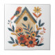 Neste azulejo cerâmico colorido, um pássaro vermelho escondido penetra em sua casa de pássaros. Flores do estilo vermelho e dourado com folhas verdes primavera no fundo da casa. Bonita!