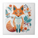 Neste azulejo cerâmico, uma bela raposa vermelha laranja com olhos azuis se espanta. A raposa tem um estilo de feitiço embelezado em azul. A imagem é colocada sobre um fundo branco, com decorações de flores e folhas correspondentes ao seu redor.