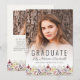 Uma bela borda floral de aquarela de flores silvestres decora a borda inferior deste cartão de anúncio de graduação de bolho de tendência. Na frente da placa, personalize a cobertura de texto da cinza de carvão em uma foto vertical do formando, com o nome do formando em script de escrita manual e o ano escolar e de aula em fonte sans serif. O verso repete a fronteira da flor silvestre sobre um fundo marfim e apresenta uma segunda foto horizontal, com espaço para detalhes sobre suas conquistas de formandos e planos futuros. Uma boa escolha para segundo grau ou formandos.