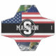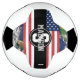 Bola de futebol personalizada com a bandeira americana e o planeta Terra como fundo. Adicione seu nome e inicial. Mostrado em vermelho com uma faixa preta e uma letra branca e cinza.