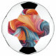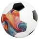 Uma bola de futebol projetada de forma exclusiva com um padrão giratório de cores vibrantes em um painel, contrastada com manchas tradicionais preto e branco.