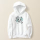 O capuz de futebol desta desportista apresenta uma "explosão" de esferas de futebol preto e branco de dimensão variada e de cor clara, cinzas e formas de estrelas brancas - personalizar com o nome do atleta, o monograma e o número de camisa - o design está na frente do capuz, mas pode ser movido ou duplicado no verso - por katz_d_zynes