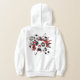 O capuz de futebol desta desportista apresenta uma "explosão" de bolas de futebol de dimensões variadas e formas de estrelas vermelhas, pretas e brancas - um pequeno padrão de bolinhas brancas sobrepõe a estrela preta - personalizado com o nome do atleta, monograma e número de camisa - design está na parte de trás do capuz mas pode ser movido ou duplicado na frente - por katz_d_zynes
