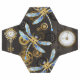 Marcadores e teclas antigas com engrenagens de ouro e latão, decoradas com libélulas mecânicas e boias em fundo castanho e listrado.