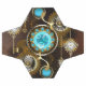 Lentes de turquesa com relógio antigo com engrenagens de latão e chaves de ouro sobre fundo enferrujado e marrom. Estilo Steampunk.