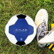 Esfera de futebol personalizada moderna e minimalista com nome em uma fonte sans serif em branco sobre fundo azul. Isso pode ser personalizado com um número de camisa do grupo e outro texto personalizado no topo e logo abaixo do nome principal no centro. Isso daria um presente de aniversário ou feriado divertido, assim como uma lembrança comemorativa.