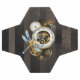 Marcações antigas com engrenagens de ouro e latão, decoradas com libélula mecânica sobre fundo castanho e listrado. Steampunk.