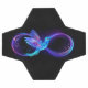 Símbolo luminoso, roxo e infinito com beija-flor azul voadora, luminosa, em fundo preto. Neon.