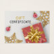 Design de férias de alta qualidade elegante com flocos de neve glamourosos de ouro brilhante, bolas de árvore de Natal vermelhas e uma caixa de presente vermelha sobre fundo de cinza leve. Este cartão de presente festivo sazonal é perfeito para a sua pequena empresa ou para oferecer amigos e família.