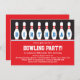 convite de festas de Boliche (4,5 x 6,25") com fileira de pinos de boliche e a palavra "Aniversário" escrita nos pinos. Texto de convite personalizável. Para obter solicitações personalizadas e ajuda para personalizar, use o link de contato de armazenamento.