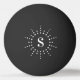 Bola preta de pingue-pongue que apresenta o seu monograma, dentro, uma borda inicial de pontos radiais que se assemelham a um sol.