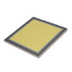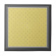 Estes azulejos decorativos divertidos apresentam um amarelo com um pequeno padrão de bolinhas de cinza no centro. A borda é limitada em uma cinza escura e clara alternada.