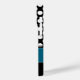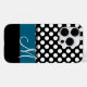 Um design gráfico giro e ousado. Grandes bolinhas pretas e brancas com um monograma azul no lado direito.