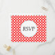 Um noivado RSVP personalizado ou cartão postal de festa com um padrão de fundo de pontos polka brancos em vermelho com itálico personalizado e letras de bloco. Clique em Personalizar para alterar fontes, dimensionamento, cores de fundo e muito mais, até salvar seu design para mais tarde.