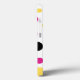 Capas de iphone de Bolinhas de Monograma Branco Retro-Rosa. Um design divertido e fresco com várias bolinhas em rosa-quente, travesseiro, amarelo e preto sobre um fundo branco. Personalize a capa de telefone com seu monograma e nome e adicione um pouco de brincadeira à sua vida cotidiana com este design alegre e colorido.