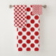 O conjunto de toalhas mostra a design vermelha de bolinhas em vermelho em branco. Para obter informações sobre personalização, entre em contato com info@KBMD3signs.com