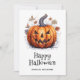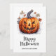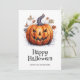 Cartão de Dia das Bruxas com aquarelas, contendo uma abóbora assustadora e folhas de outono. Personalize facilmente este cartão minimalista do Dia das Bruxas com seu nome e texto de família.