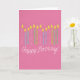 Um cartão de bolo de aniversário cor-de-rosa, desenhado com velas bonitinhas coloridas. Caneta e lápis foram usados nesta placa para desenhar dos elementos. Um cartão de aniversário para quem ama rosa tanto quanto nós.