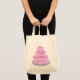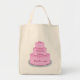 A pintura de um bolo cor-de-rosa de três camadas decorado com rosas claro e guarnições cor-de-rosa escuro, em uma prata, com marcadores para o seu texto personalizado, é impressa em sacos de tote personalizados. O texto é fácil de personalizar e coordena com o bolo. Obrigado pelo apoio de CherylsArt no Zazzle.
