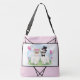 Imagem atrativa em uma bolsa de corpo cruzado de um casal de lama vestindo suas roupas de casamento com corações flutuando ao seu redor.