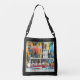 Art Deco Boston Swan Boats on black background cross body saco Um saco de corpo colorido desenhado criativamente apresenta uma imagem das Boston Swan Boats sobre um fundo preto utilizando um filtro de deco de arte aplicado. Por celeste@khoncepts.com