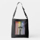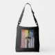 Saco de corpo cruzado com chuva colorida arco-íris caindo na silhueta com um guarda-chuva. A arte original de Ray Bean é acrílica em conselho de canvas.