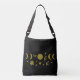 Este design apresenta uma mistura harmoniosa de motivos celestes e botânicos renderizados em folha de ouro cintilante contra um fundo preto profundo. No centro, há uma lua cheia radiante, ladeada simetricamente por fases da lua crescente que evocam o ritmo dos ciclos lunares. Ao redor desses elementos celestes, há floreios delicados: ramalhetes frondosos, uma flor estilizada, um coração e um único ponto — cada um contribuindo para o senso de equilíbrio e elegância orgânica. A composição é visualmente centralizada e espaçada de forma pensada, criando uma sensação de calma e conexão cósmica. A textura da folha de ouro adiciona profundidade e luxo.