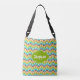 Allover de impressão tote saco com uma design brilhante e ousada de stripe chevron de laranja, azul-aqua, castanho, verde e branco com um banner verde e uma área que você pode adicionar um nome para personalizar.