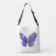 Borboleta de flores cinza, azul, safira, espumante com asa decorada com flores preciosos azuis com folhas de ouro sobre fundo branco.