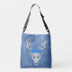Esta mala em todo o corpo do impressão é uma mistura de tons azuis e brancos com uma cabeça branca de cervo com traficantes e olhos azuis com três grandes rosas azuis no topo da cabeça, na frente e atrás.