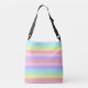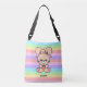 Saco de corpo cruzado listrado, de cor pastel, com um coelho kawaii super fofo segurando um morango. Há texto personalizável na frente onde você pode adicionar seu nome ou slogan