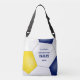 Esta equipe de futebol colore o bolsa de corpo cruzado para o treinador de futebol de criança ou menina apresenta a imagem de uma bola de futebol azul, dourada e branca de tamanho abstrato sobre a qual você pode personalizar o nome do treinador mais o nome da escola e mascote e ano/estação escolar - por katz_d_zynes