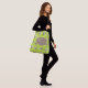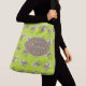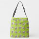 Large tote or shoulder bag for knitting supplies and projects. A pattern of white lambs covers the bag. The background design is thin, bright green, vertical stripes. Personalize with a name and "knitting bag" or "project bag" on the front over a beige banner. This cross-body style has pockets (one zipper) inside and comes in two sizes. Read more in the product description, or choose the open tote.