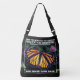 Crossbody Bag preto (grande) com uma imagem de borboleta Monarca em um círculo e rodeado por "E SE OS MONARCHS FOSSEM PARA O INVERNO E NUNCA VOLTARAM SALVAR OS BOTTERFLIES MONARCH" também com I-BONE LTD. As borboletas Monarca são um presente para nossos olhos, e sua incrível migração multigeracional do Canadá para o México é uma das maiores histórias de migração de todos. Gostamos e apreciamos. Como nos sentiríamos se os monarcas saíssem para o inverno e nunca voltassem? Como gostamos dessas criaturas maravilhosas, e esperamos que elas continuem para sempre.