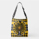 Crossbody Bag preto com design de dente dourado na frente e preto, branco e círculos concêntricos dourados design e "COLUMBIA, MISSOURI CENTER DO UNIVERSO" e o logotipo Y-NOT-ME no centro e "Columbia, MOI" no topo com o logotipo Y-NOT-ME e Y-NOT-ME no fundo sobre o dente preto e dourado design. Esta design é um centro de educação de mais alto, Columbia, Missouri.