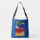 Saco de corpo cruzado com imagem de um céu colorido arco-íris com nuvens e estrelas. O trabalho artístico original é gravado no conselho da canvas.