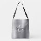 Este elegante saco de corpo cruzado personalizado apresenta um monograma e primeiro nome em um moderno roteiro preto e branco sobre um fundo de metal esfregado falso prateado.