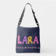 Bonito gráfico com o nome do monograma, design de saco. Ideal para um presente personalizado para uma garota que tem um nome Lara. Este exemplo diz Lara. A cor de fundo é atualmente marinho azul, mas você também pode mudar isso para sua própria escolha de cor, se necessário. Ideal como presente especial de aniversário ou celebração. Se precisar de ajuda com seu próprio nome personalizado, entre em contato comigo. Letra maiúscula L corações tipográficos e flores desenho e conversão gráfica em tons de rosa brilhante e roxo © Texto artístico único e design por Sarah Trett. www.sarahtrett.com para www.mylittleeden.com