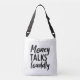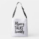 O design da bolsa apresenta a frase "o dinheiro fala alto" em uma fonte negra e ousada. O design é simples e atraente, com uma mensagem forte que certamente ressoará com os espectadores. É uma forma excelente de mostrar a sua confiança e ambição.