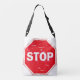 Cruze o saco de tote de corpo com a imagem de Parar para trás e Ir assinar na frente, em cores vermelha, verde e branca.