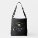 Saco de corpo cruzado de graduação de nome personalizado moderno com caligrafia de script de tendência lendo CLASS sob um boné de ouro impresso. Personalize com seu nome em um arco e no ano de sua graduação.