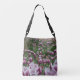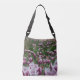 Saco de corpo cruzado com fotografia de um campo de tulipas roxas e brancas. Foto original de Ray Bean.