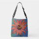 Esta bolsa transversal apresenta uma bela zinnia alaranjada vermelha contra um impressionante fundo azul e verde.