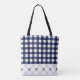 Esta bolsa elegante e personalizada de tote apresenta um padrão clássico azul e branco de verificação marinho com um monograma personalizado "M" e o nome "Morgan" numa letra na moda-cursiva. A parte inferior da bolsa mostra um padrão de diamante de cinza clara adornada com pequenos corações azuis marinhos. Perfeito para uso diário, compro ou como presente pensativo. Alças pretas duráveis fornecem conforto e estilo.