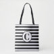 Um saco de tote personalizado que tem um padrão listrado preto e branco. No centro, há um logotipo de monograma que pode ser personalizado com sua inicial. Este produto faz um presente de excelente para qualquer ocasião.
